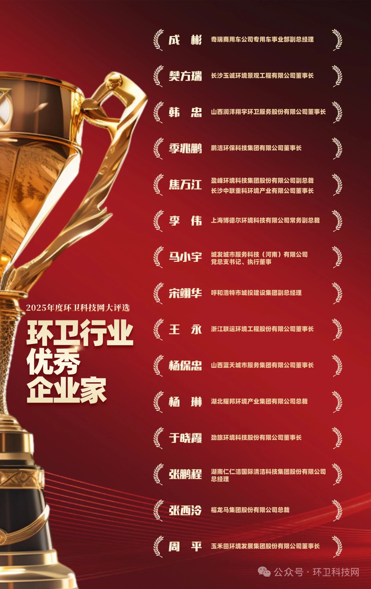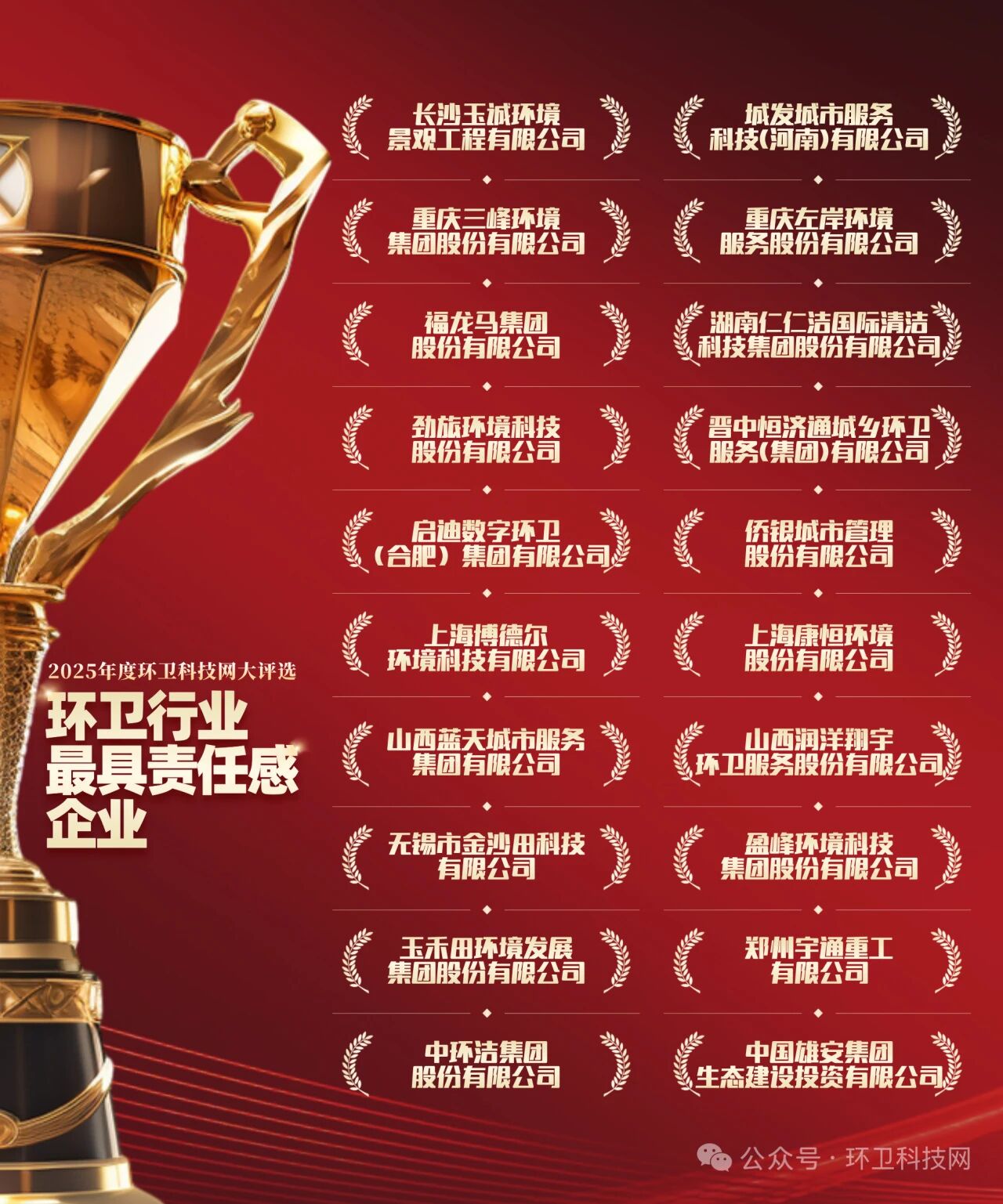2025-09-249 月 16 日,环卫科技网年度大评选获奖名单正式揭晓。经过严格的评审流程,最终评选出 20 家环卫行业最具责任感企业以及 15 位环卫行业优秀企业家。